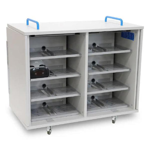 The' LapCabby 32 Vertical' charges 32 devices up to 17" screen size laptops and Chromebooks including protective cases. Sliding shelves store devices vertically with dividers and specially moulded rubber mats...