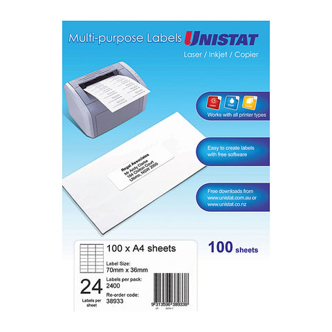 Unistat LIP Label LIP 24Up 70X36mm Bx100 are ideal for addressing and other applications. Suitable for laser printers, inkjet printers and copiers. Self-adhesive ensures labels stay secure. Natural white finish.Cartridge...